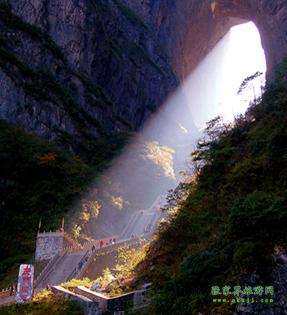 中國最高的自然“天門洞” 公元263年即三國吳永安永安六年時(shí),吳王孫休見其高峻雄偉,巍峨壯觀,便將武陵郡分置天門郡,從此天門冊名傳遐邇,譽(yù)貫古今。天門洞周圍簇涌著丹灶,老僧、玉壺、玉堂、金匱、筆架、將軍、箭桿、漆圓、弩牙、猿點(diǎn)、天姥、負(fù)兒、簸箕、雞籠、高遠(yuǎn)等16座山峰,其間又鑲嵌著雷、電、風(fēng)、云、泥、蛇、龜、祖師、玉皇、鬼谷、果老、玄天、合山、求兒、鐘鼓、老龍等16洞府,幽默盤亙,使得天門山在雄偉之中又增添了神奇和秀麗。流水清洌的澧河為天門山頻映倒影,寬廣低平的田疇為其鋪就如茵綠毯,繁茂的森林裝點(diǎn)著山基和山頂,淡云薄霧為她峨冠霞佩,朝暉夕照為她斜染紅裝。隨著四季的更替,她春茵夏碧秋金冬縞,呈現(xiàn)出無窮的變幻。天門山生態(tài)系統(tǒng)給天門洞的神奇增添了新的魅力。 據(jù)說,天門洞開景區(qū)的有上天梯。有著九百九十九級臺(tái)階的上天梯!