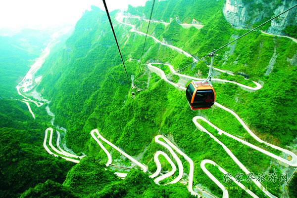 考慮到索道運(yùn)行時(shí)間較長,高溫時(shí)游客們需要通風(fēng),每個(gè)轎廂專門設(shè)計(jì)了兩個(gè)通風(fēng)窗,以形成空氣的對流,這人性化設(shè)計(jì)在國內(nèi)是唯一的。索道鋼繩則來自于法國,直徑50.1mm,每米重達(dá)10kg,確保游客安全無虞。 天門山索道最大的亮點(diǎn)就是它的爬坡面支架的設(shè)計(jì) ,這個(gè)支架共有壓索輪96個(gè),托索輪16個(gè),它綜合了現(xiàn)代物理學(xué)、現(xiàn)代工程學(xué)、現(xiàn)代制造業(yè)中最先進(jìn)的理論和成果,應(yīng)用了世界最先進(jìn)的索道技術(shù),從而使這段索道總給人一種蕩氣回腸、氣勢沖天的感覺。 天門山索道以張家界市中心的城市花園為起點(diǎn),直達(dá)天門山頂?shù)脑伎罩谢▓@,猶如一道彩虹飛渡“人間” “天上”,又象一條巨龍騰翔素云蒼穹,依山籍壁,拔地沖天,蕩氣回腸,恢宏壯觀,成為天門山旅游風(fēng)景區(qū)“四大奇觀”之一,為張家界這一世界級風(fēng)景名勝區(qū)又添絕世奇景。
