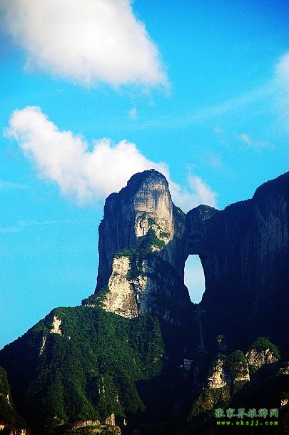 天門洞簡介 天門洞是天門山最具有代表意義的景點(diǎn),它位于天門山山體的中上部,海拔1300米,門高131.5米,寬57米,深60米,是世界上最高海拔的天然穿山溶洞。 天門洞南北對開于千尋素壁之上,扶搖而通天,氣象變化萬千,似明鏡似天門鑲嵌于蔚蔚天幕之上,終年吞白云吐紫霧,渲染著神秘莫測的氣氛而更顯出塵脫俗,正所謂奪盡天地之造化,藏盡天地之玄機(jī),而成為千古難解之謎,尋尋覓覓,終是難解。置身其間,宛如入身天宮帝閣一般,大有“我欲乘云仙飛去,直入九霄攬乾坤”之感。“天門洞開云氣通,江東峨眉皆下風(fēng)”元朝的著名詩人張兌曾這樣贊嘆,磅礴的氣勢由此可見。